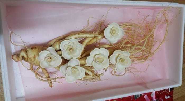 - Nhân sâm tươi: Rễ nhân sâm tươi có tuổi đời trên 6 năm tuổi, hoa sâm hình hoa hồng được kết thành từ củ nhân sâm.